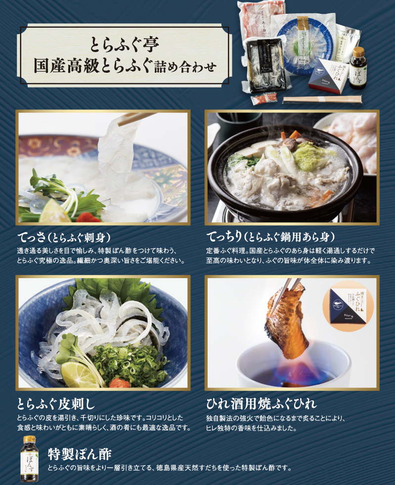 ※三段重は3~4人前、国産とらふぐ詰め合わせは2~3人前です。